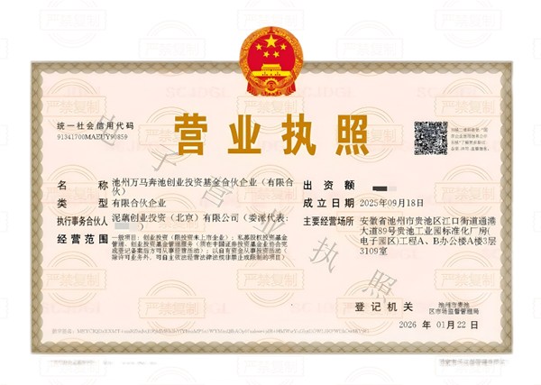 1月22日,“池州万马奔池创业投资基金”完成工商注册,取得营业执照,标志着池州市首支人才基金正式设立!该基金由池州市人才发展集团牵头,在贵池区政府和市产投集团共同支持下发起设立,是落实“万马奔池”人才计划、强化人才金融支撑的重要实践。