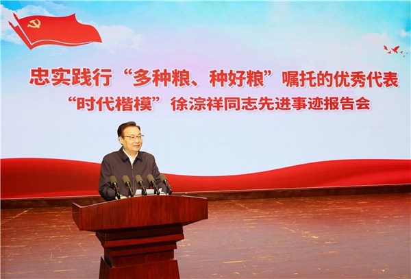 梁言顺在讲话中指出,徐淙祥同志坚定践行习近平总书记重要指示重要回信精神,以老黄牛般的韧劲探索科学种粮,带动广大小农户多种粮、种好粮,充分体现了新时代农民积极向上、拼搏奋斗的精神面貌,展示了乡村科技人才锐意进取、敢为人先的坚定追求,彰显了共产党员奋进新征程、建功新时代的使命担当。全省各级党组织和广大党员、干部要学习徐淙祥同志对党忠诚、勇担使命的政治品格,始终心系“国之大者”,矢志不渝紧跟核心奋斗。要学习徐淙祥同志扎根泥土、苦干实干的敬业精神,脚踏实地狠抓工作落实,创造经得起实践、人民、历史检验的实绩。要学习徐淙祥同志刻苦钻研、勇于创新的执着追求,以创新思维破解“创新之问”,敢闯敢拼打开发展新天地。要学习徐淙祥同志践行宗旨、为民造福的高尚情怀,让发展更有温度、民生更有质感。